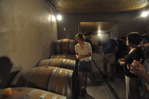 女主人Coralie介紹著她發酵著佳釀的木桶