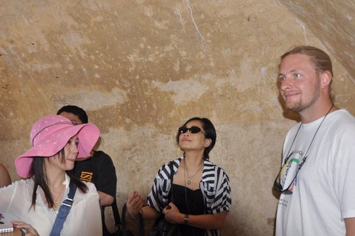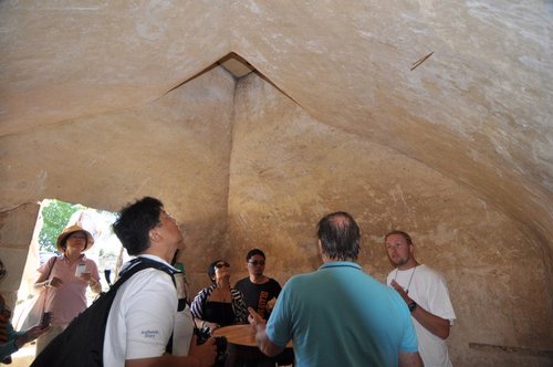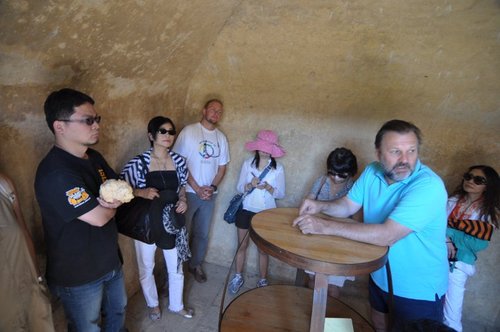 帥哥告訴我們:這個存酒桶經科學判定有1238年歷史,我們在其內部參觀