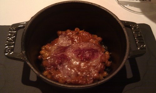 Confit tomatoes and black olives tapenade, with coppa and italian fregola sarda