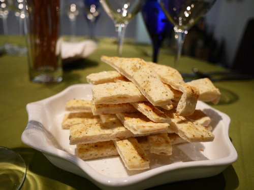 脆餅。灑了起士粉的薄餅麵包,沾橄欖油醋,好吃!