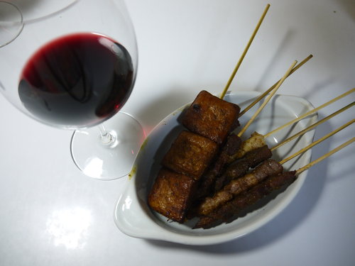 經適當調味烘烤的羊肉串,鮮嫩多汁,搭配Cabernet Sauvignon