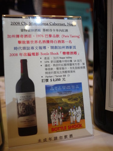 在一旁看到這攤的人超多,過來一看才知道,台灣終於有酒商代理 Chateau Montelena的酒了!戀戀酒鄉(Bottle Shock)裡所介紹當年打敗法國酒的主角 – Chateau Montelena Winery,這家酒莊可以說是把Napa炒出名氣的酒莊之一,相信在台灣也有不少同好是因為這部片,才開始進入Napa Winery的世界。