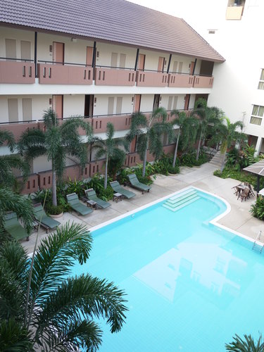回到飯店,終於在泳池旁(只有白天照片),品嚐到本地大象牌啤酒