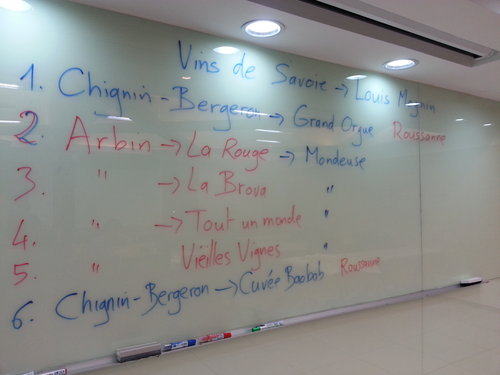 課堂中首先會品嚐一款罕見的粉紅氣泡甜紅酒──rosé de Cerdon。接著是一款氣泡白酒──vin blanc effervescent de Seyssel,然後是一款老葡萄樹的白酒──Roussette de Savoie (vin blanc) vieilles vignes,最後是一款產區最佳白酒──le Clos de la Péclette