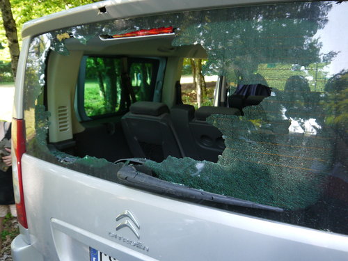 遊憩Lac de Chalain畢,準備回飯店竟發現車子的後車窗竟被打破了!同行的Garfield的最新單眼相機與包包被歹徒帶走,裡頭有大筆歐元現金,而我們則是被偷了一支Arbois Vin de Paille 2009與皮衣….心疼著那支乾草酒,聰明的歹徒可以開來慶祝了!(幸好後續Garfield的護照與DM針劑有好心人撿到並緊急聯絡我們)