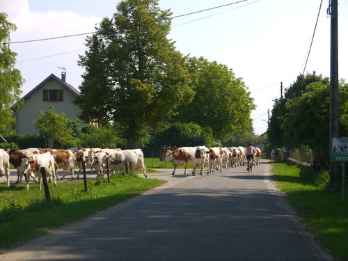 前往Lac de Chalain的路上,我們碰到了牛群剛放牧完正要回家,馬路上塞牛的情景。