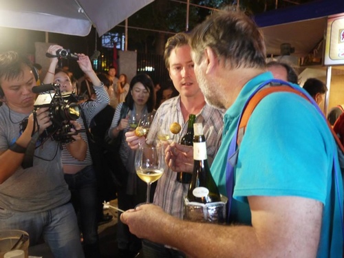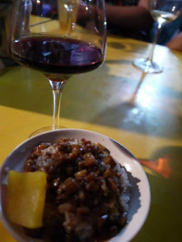 Serge教授說,台灣小吃90%都搭白酒! 是的!很多辣的香辛味的搭微甜白,一般白酒也搭台式小吃。我推薦的烏魚子搭紅酒也很讚! 還一圓我在布根地時很想用紅酒搭滷肉飯的夢想!! 很多有趣的火花在夜市發生~~但有很多店家,根本不讓帶酒杯的客人上門……by Diana