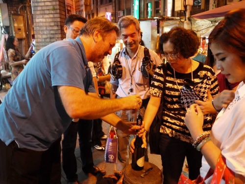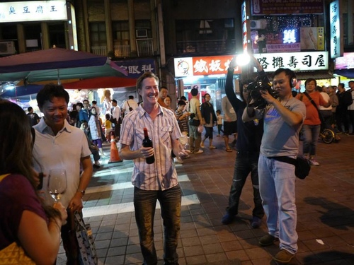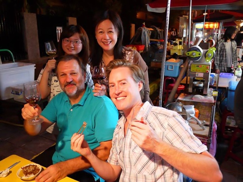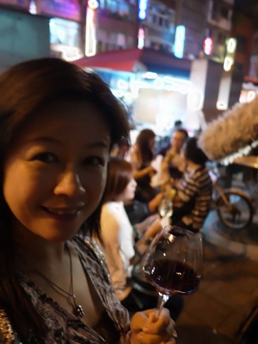 台大進修推廣部紅酒研習班的前後期同學在Serge教授(唐老師)帶領下,來到寧夏夜市,找尋搭配法國酒的夜市美食;還有黃嘉千老公夏克立主持的“我在台灣。你好嗎?“的節目錄影!整個寧夏夜市被我們一行人搞得鬧哄哄~有些店家看到我們一行拿著酒杯立馬拒絕,有的店家則熱情招呼,沿途都是拍照的遊客,這就是可愛的台灣,擁有不同的文化差異吧!哈哈~~