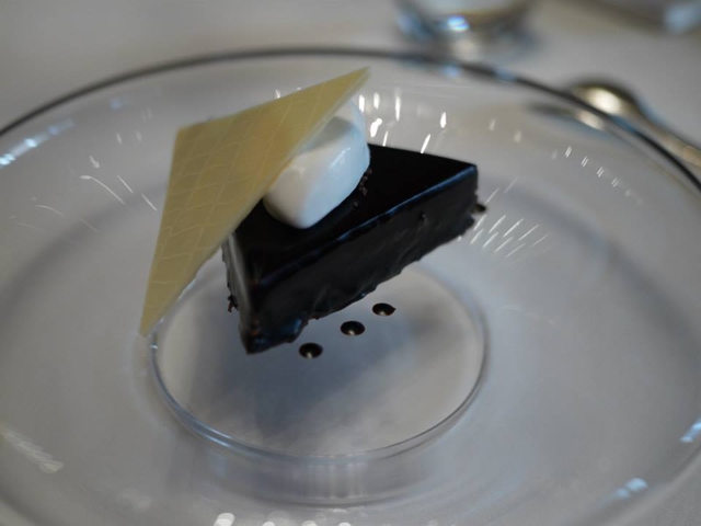 甜點2:40%牛奶巧克力慕斯蛋糕配可可塗醬及椰子雪葩