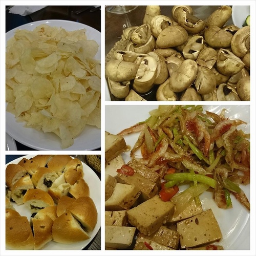 (開胃菜:洋芋片、烤蘑菇、特製藍莓麵包、滷味拼盤)