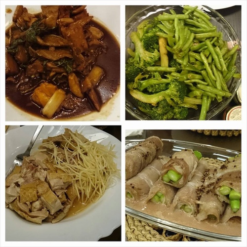 (熟食上場:三杯透抽、魯味蔬菜、煙燻鵝、烤箱料理–培根捲蘆筍)