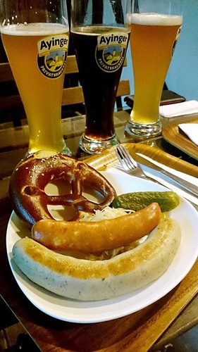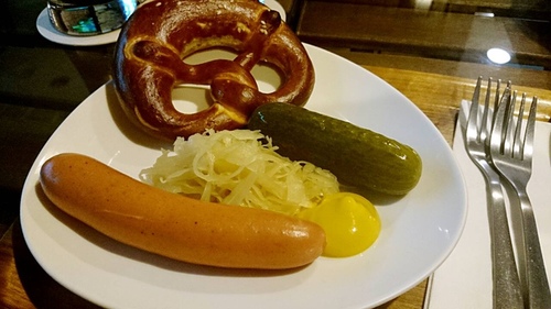 搭配美味的德式柏克豬肉香腸,佐芥末、德國酸菜、蝴蝶結德是鹹麵包