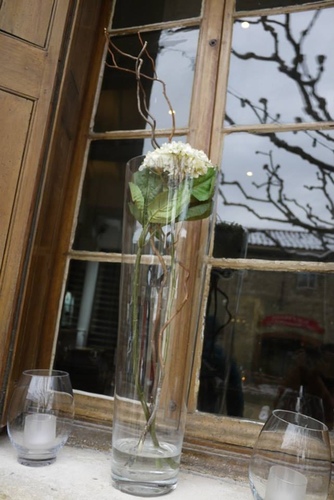 餐廳門口的繡球花,在雪地中非常突兀,讓人期盼春天~