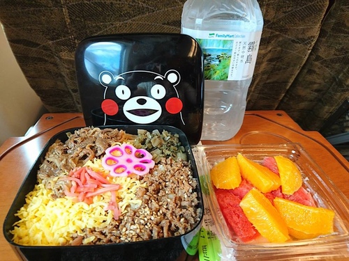 搭火車一定要吃火車便當的概念!這款便當是在熊本駅內超商選購,當點心用,熊本駅便當樣式多,這只是其中一款。超卡哇依的熊本熊便當盒,吃完擁有它^^