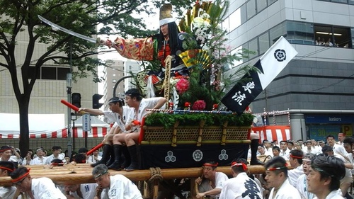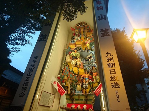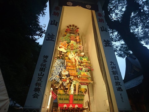祗園祭為日本重要的祭典活動由每年的7月上旬舉辦,在排定的日子裡會有各種活動,而到7月15達到高潮 – 跑山笠。每組前面有開路,比賽用山笠上有坐幾個指揮,下面的人則把山笠拉著跑,比看哪一組人馬最快到終點,是博多重要的無形文化財!