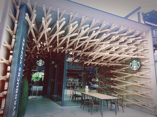 姐是來咖啡廳朝聖的~鳥巢般的木椿設計,是大師隈研吾傑作!