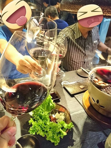 傳說中的台北三大燒肉店~大腕/Moe燃/老乾杯之一,周末夜晚由美食家Vic(茂松)相約,預計六人喝四支葡萄酒,三紅一香檳,每瓶約1500元,帶酒者報價均攤。就這樣和酒友舉杯聚聚~~
