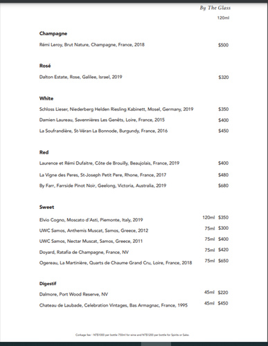香檳、紅、白、清酒 每瓶(750ml) NT$1,000。烈酒每瓶 NT$1,500。