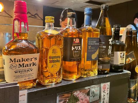 在我們座位面前的還有一排威士忌,在日本,很多地方都水割或氣泡水割(加水加冰,或氣泡水加冰)這樣喝