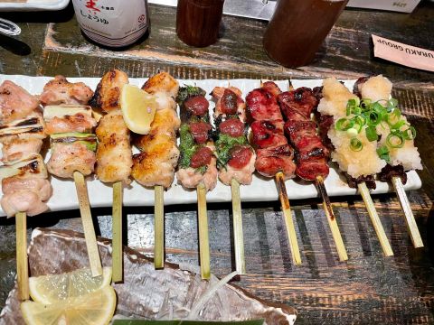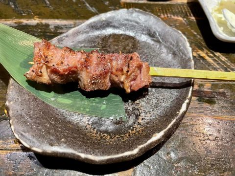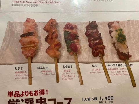 由左到右 雞肉蔥串、雞臀部、紫蘇捲雞肉、雞心、牛橫膈