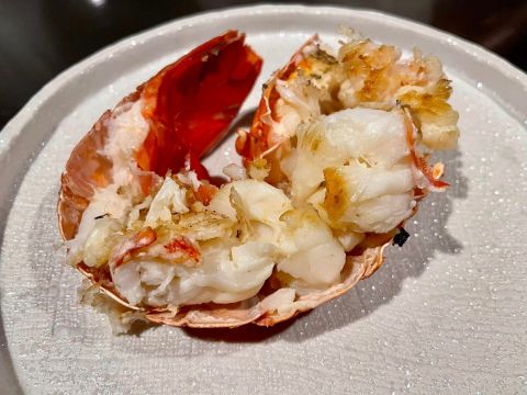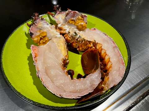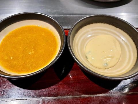 我喜歡搭左邊龍蝦高湯,海味十足;友人喜歡搭右邊美乃滋,增添層次