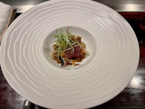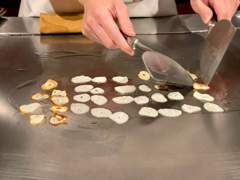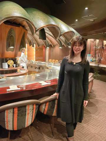 一位鐵板燒師傅僅服務二位客人,餐間跟我們解說,但是實在聽不懂><