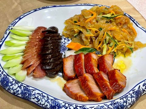 搭配大三元拼盤,有叉燒、香腸、臘腸、海蜇皮等。