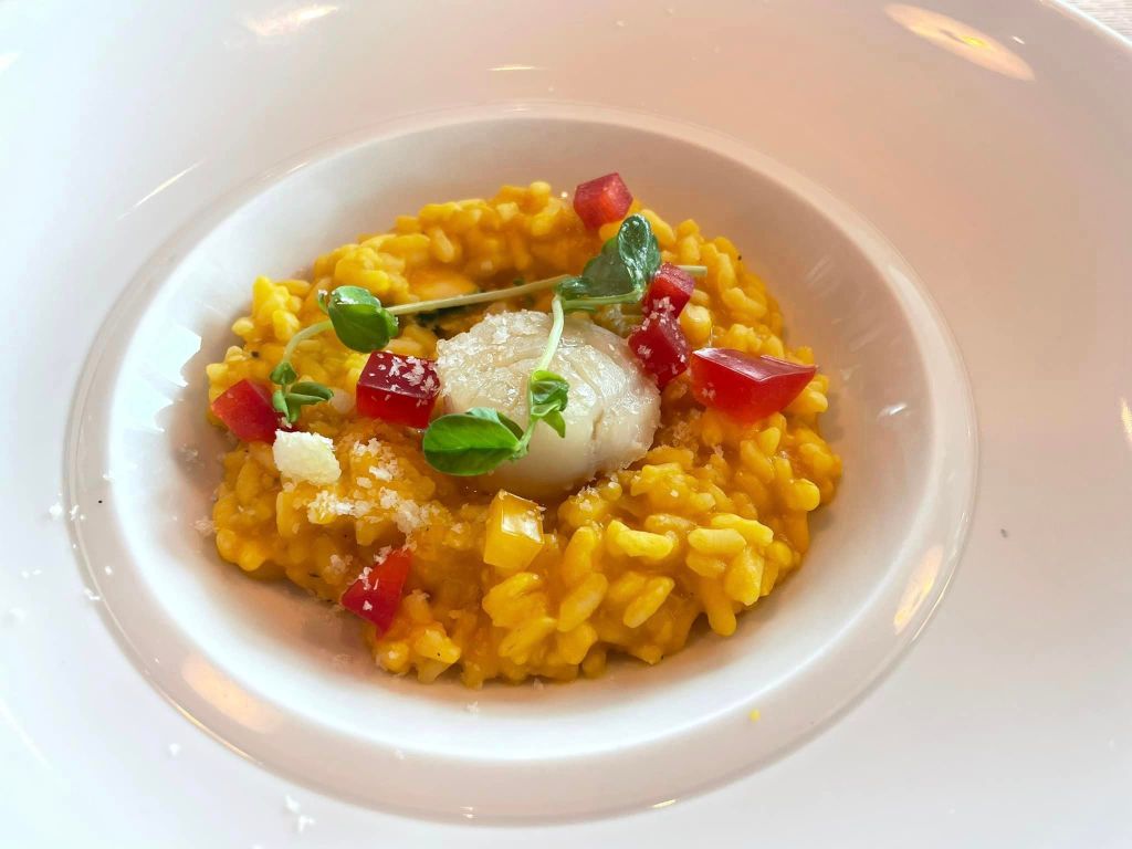 搭餐:炙烤嫩干貝襯魚子醬與帕米吉亞南瓜燉飯 Risotto With Scallop Top With Caviar In Pumkin Sauce 。