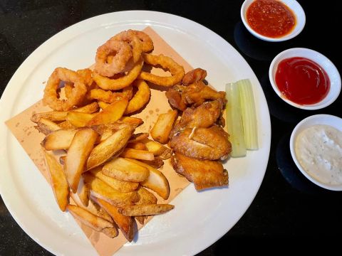 炸物拼盤,有酥炸花枝圈、香酥小雞翅、帶皮薯條。非常有水準的好吃、下酒!