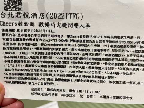 『Cheers歡飲廊』位在台北君悅酒店一樓,這是使用的是旅展的「歡暢時光晚間雙人券」券,1490元可以享用炸物拼盤、生啤酒與40款調酒無限暢飲,非常適合小資族可以享受五星級飯店的美味與服務卻不用花大錢~