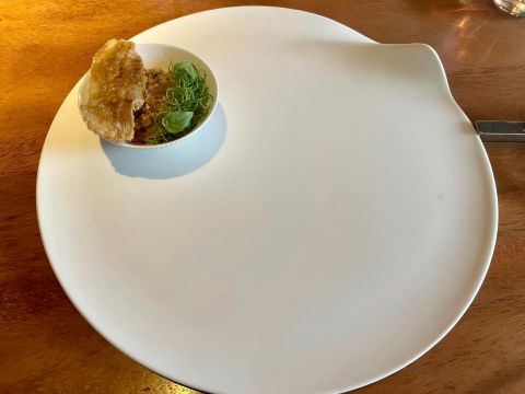 呈盤手法簡約雅緻,帶有美學的意境。雞皮脆片、以「甘露煮」手法烹調的雞冠與茄子,以及奶油烤過的雞肉絲,搭配蔥絲、紫蘇葉絲與九層塔絲一起呈現。
