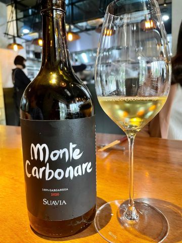 義大利白酒。100% Garganega。裙子金黃,清爽柑橘、草本植物,入口西洋梨,礦石尾韻,帶微苦。搭配軟絲。