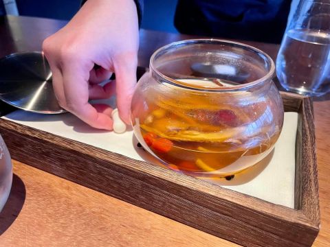 傳遞的是「四神湯」風味,並以「蒸蛋」形式呈現。可滴上用當歸、參鬚、紅棗,以及枸杞泡製的藥酒增加風味。