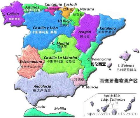 西班牙目前按照行政區域可劃分為以下17大產區,而許多DO和DOCa產區則往往會相互跨越了這些大產區。