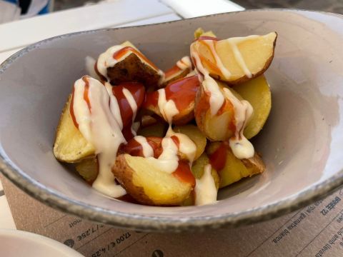 馬鈴薯與起司,與辣椒醬。奇特的搭配,吃起來辣辣的。