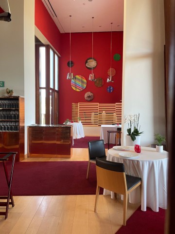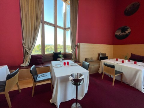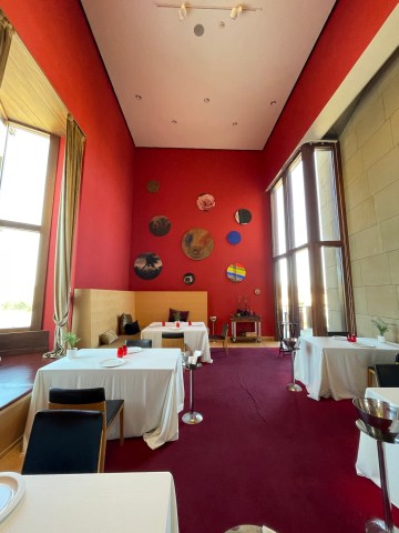 餐廳賞~紅色為主的色系,搭配窗外綠油油的葡萄園,甚美