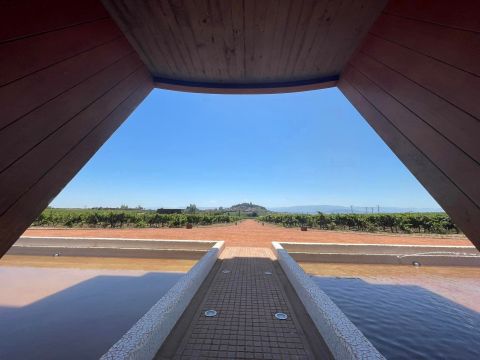 入口處的水池不僅能降低當地炎熱的溫度,亦能反射出酒莊銀色波浪狀屋頂的風樣貌。