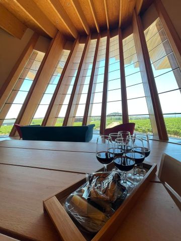 美輪美奐的酒莊由著名西班牙建築大事Santiage Calatrava設計,被譽爲世界當代三大建築物之一。酒莊雄偉的波浪式外形與周圍環繞的山巒遙相呼應,完美融合;遠看又像似翻滾的海浪或者是疾風吹拂着枝繁葉茂的葡萄園,引來無限遐思。
