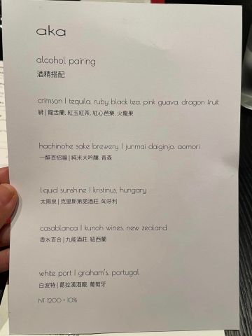 我覺得這是我吃過餐酒搭很棒的餐廳,比起許多台北米其林一星的搭配更好,這個搭的有特色,強調出食材的風味,而酒是很棒的綠葉,品嘗來自不同產地的特色。迫不及待先分享alcohol pairing的部分: