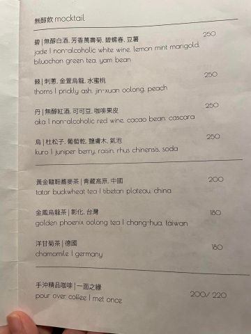 Fine dining氣氛、環境、餐點佳,是東區知名餐廳山男YAMASAN的主廚王一山的新作。在這裡享用了很棒的alcohol pairing~墨西哥玉米餅搭龍舌蘭調酒令人驚艷;牡蠣搭純米大吟釀香甜;午仔魚搭匈牙利橘酒;牛小排搭紐西蘭紅酒;甜點搭葡萄牙白波特甜蜜有芭樂味^^