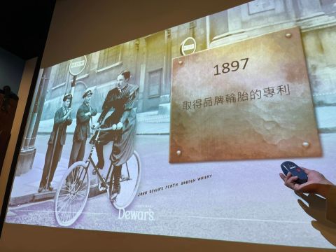 1897年,取的品牌輪胎專利。當時沒有柏油路,印有John Dewar’s品牌的輪胎在泥土地面上留下品牌廣告,成功推銷