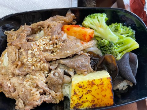 主餐有鹽烤豬肉飯與日式牛肉炒麵