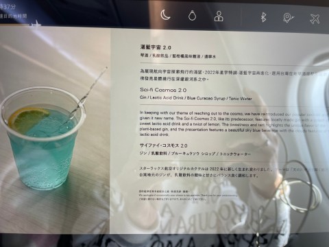 星宇航空的餐酒,我覺得中規中矩,沒有好吃到感動,但也對味。來回程都有點星宇特調,去程湛藍宇宙2.0、回程曙光莫西多,拍照好好看,還是要自己喝過才知道!(我覺得都偏淡)