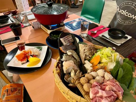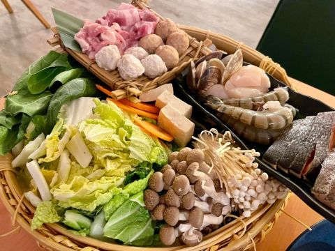 主鍋有干貝、大蝦、蛤蠣、鮭魚、白肉魚,各式肉丸、豬肉、各式蔬菜、菇類…食材豐富頂級