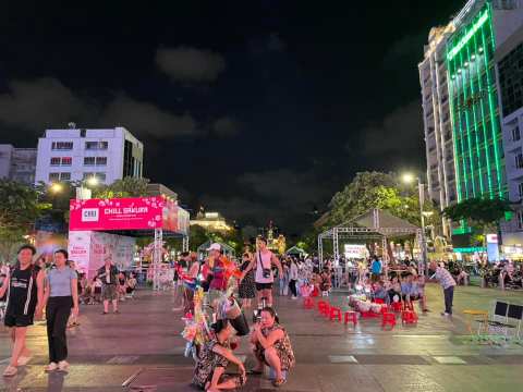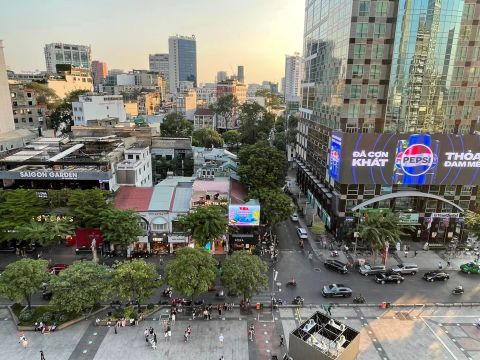 居高臨俯下看川流的胡志明市街,下方Nguyễn Huệ阮惠步行街白天夜晚都很熱鬧