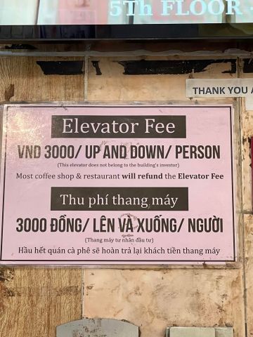 搭電梯一人3000元(約台幣4塊錢)。當然可以選擇不搭電梯走樓梯就好,我們是付電梯費搭到10樓,再往下走