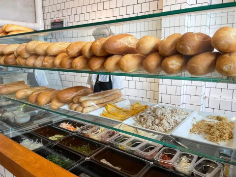 第一份點豬肉鬆口味,加二份冷飲。越南的法國麵包吃起來 好辣、好脆、有嚼勁,吃完一份胃開了