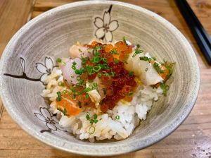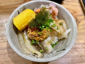 海鮮蓋飯,除了散壽司材料,多了星鰻與炙燒鰭邊肉、還有一種魚卵與海葡萄