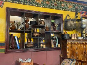藏餐廳的桌椅,都是矮桌配很大的矮木椅,搭上當地藏風格的抱枕和椅墊