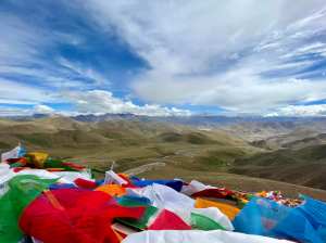 巨型石雕牌樓與五色經幡風馬旗,適合拍跳拍